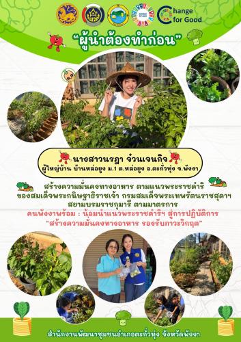 นางสาวนรฎา จ๋วนเจนกิจ ผู้ใหญ่บ้าน บ้านหล่อยูง หมู่ที่ 1 ตำบลหล่อยูง อำเภอตะกั่วทุ่ง จังหวัดพังงา ต้นแบบ “ผู้นำต้องทำก่อน” ในการน้อมนำแนวพระราชดำริของสมเด็จพระกนิษฐาธิราชเจ้า กรมสมเด็จพระเทพรัตนราชสุดาฯ สยามบรมราชกุมารี สู่ปฏิบัติการ คนพังงาพร้อม : น้อมนำแนวพระราชดำริฯ สู่การปฏิบัติการ "สร้างความมั่นคงทางอาหาร รองรับภาวะวิกฤต” โดยการใช้พื้นที่ว่างบริเวณบ้านปลูกพืชผักสวนครัว เป็นต้นแบบในการพึ่งพาตนเอง ลดรายจ่ายในครัวเรือน และแบ่งปันให้กับเพื่อนบ้าน ซึ่งเป็นการเสริมสร้างภูมิคุ้มกัน พร้อมรับมือกับสถานการณ์ต่าง ๆ